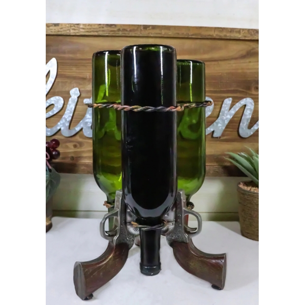 Exiba suas garrafas de vinho facilmente com este atraente porta-pistola triplo. Três pistolas de seis tiros se encontram em seus canos e apresentam anéis de metal torcidos para armazenar com segurança garrafas de vinho do pescoço para baixo. Feito de resina.