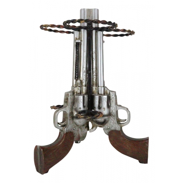 Esta escultura de porta-vinhos Triple Revolver Guns é feita de resina composta de designer e anéis de metal, pintada à mão e polida individualmente. O tom da cor pode variar ligeiramente das fotos.