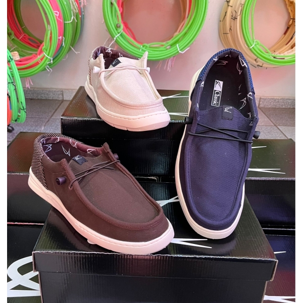 Modelo feito em tecido com cadarços elásticos e solado classic flex nas cores Azul, Café e Creme.